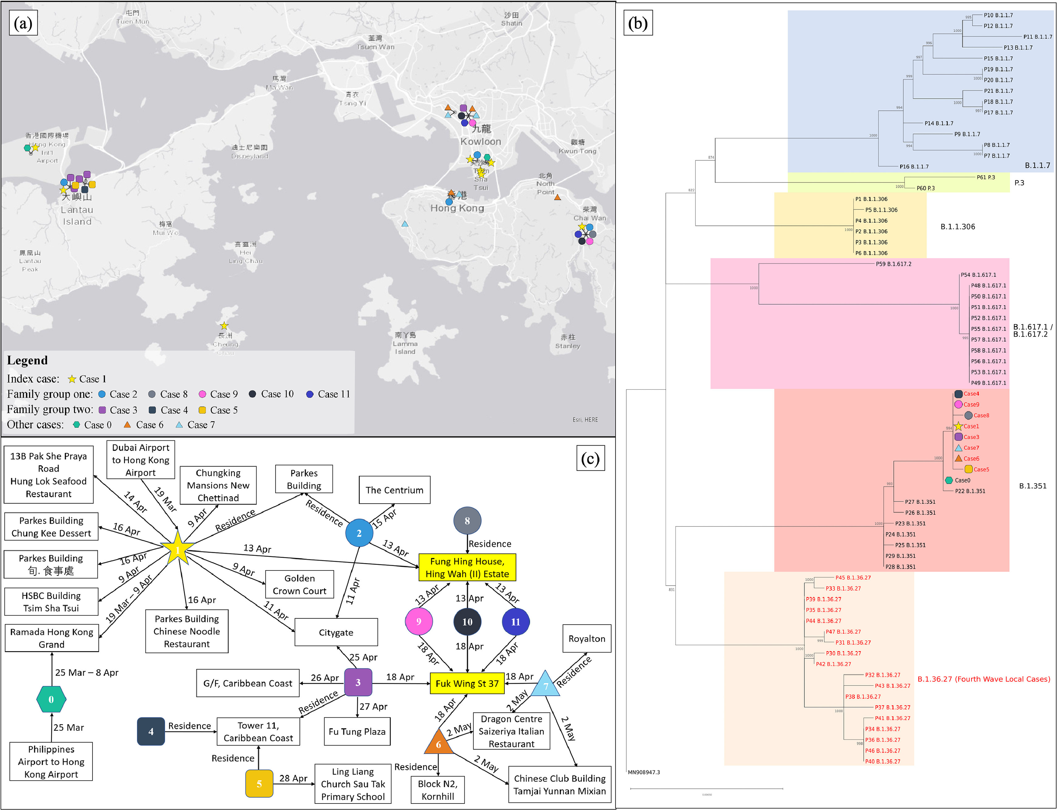● Phylogeographic analysis of the genomic and spatial relationship among the patients with SARS-CoV-2 VOC B.1.351 in Hong Kong.